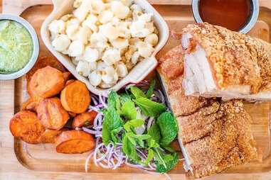 Che Fico and Che Fico Alimentari : Che Fico is offering a four-course tasting menu featuring a truffle gnocchi and wood oven-roasted bistecca with spiny lobster ($195 per person with an optional $90 wine pairing). Its downstairs sister restaurant is offering a three-course, family-style tasting menu featuring braised lamb shoulder with an optional add-on of lasagna alla bolognese topped with truffle (and also has outdoor seating) for $110 per person. Want to enjoy your meal at home? There's a pick-up menu with options like caviar for two, black truffle lasagna bolognese, and bottles of bubbles.